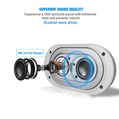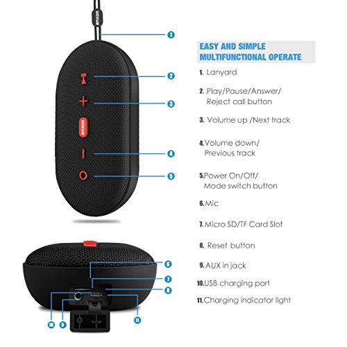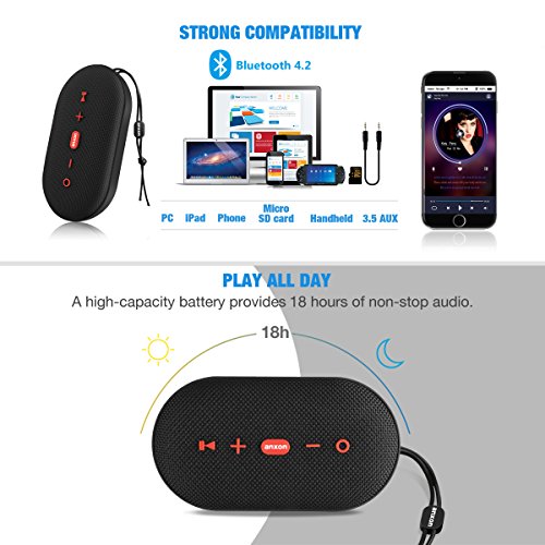 -. Feature : IPX5 Waterproof: Anxon has top level waterproof able to withstand full immersion of up to 33 feet for 30 minutes.it's dustproof, snowproof, mudproof, waterproof or even being dropped. Confidently take Anxon for shower, boat, hiking, camping, risk, to the beach, pool, or just your backyard. With Sporty looks, great gift for summer holiday. / Complete Compatibility: Easily connect any device with a playlist to have continuous sound for any occasion. Tablets, cellphones sync in a snap with Bluetooth 4.2. Works great with iPhones, iPad, Samsung, HTC. Micro SD (TF) Reader Slot supports playback of MP3 files. Wired connection with PC, TV and other non-Bluetooth devices with 3.5mm audio jack. Use Anxon for hands-free calling. You can even do Karaoke with the unique 3.5mm external microphone to have a backyard party. / Booming Bass and Full Volume: Get 18W sound with Anxon's two 9 watt full-range drivers and two passive radiators. Super bass booms with less than 1% total harmonic distortion. A perfect gift for music lover with an active lifestyle. / Long Play Time Fast Charge: Get the play time you want with a 2200mAh rechargeable battery that can go for up to 18-Hour (At 50% volume, playtime varies according to volume level and audio content) Quick charge gets back to full in about 2.5 hours. / What You Get: Comes with Anxon Bluetooth 4.2 speaker, a Micro USB charging cable, Quick Start Guide. Our Worry-Free 12 Month Warranty plus our lifetime customer service makes your purchase absolutely risk-free.