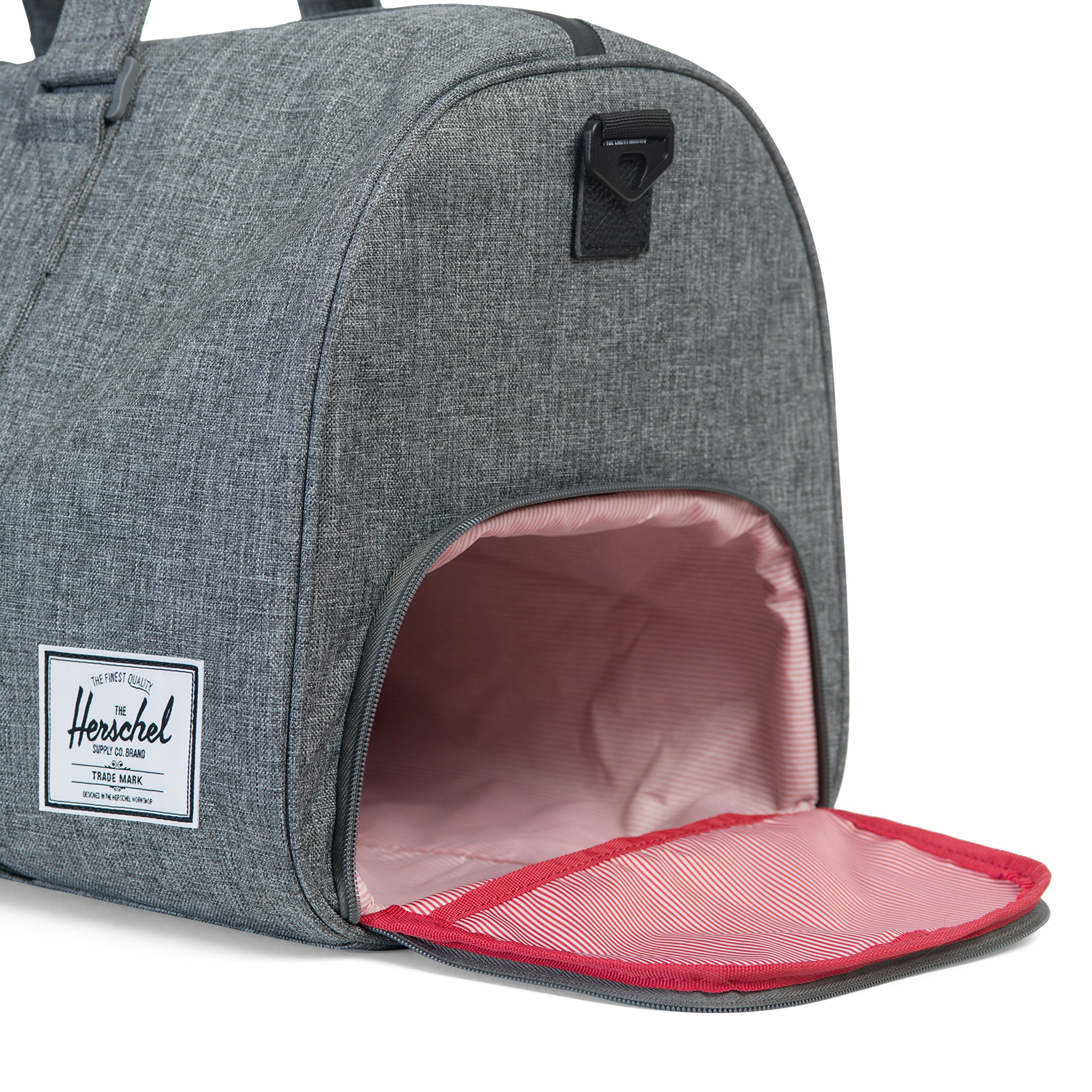 Boston bag combining functionality and utility, such as plenty of storage capacity and pockets to divide shoes.