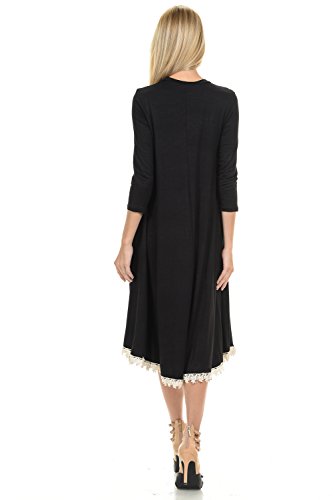 This dress features 3/4 sleeves, crew neckline, midi lenght and crochet lace trim at the bottom. It is made with a soft jersey knit that will create a beautigul drape.
