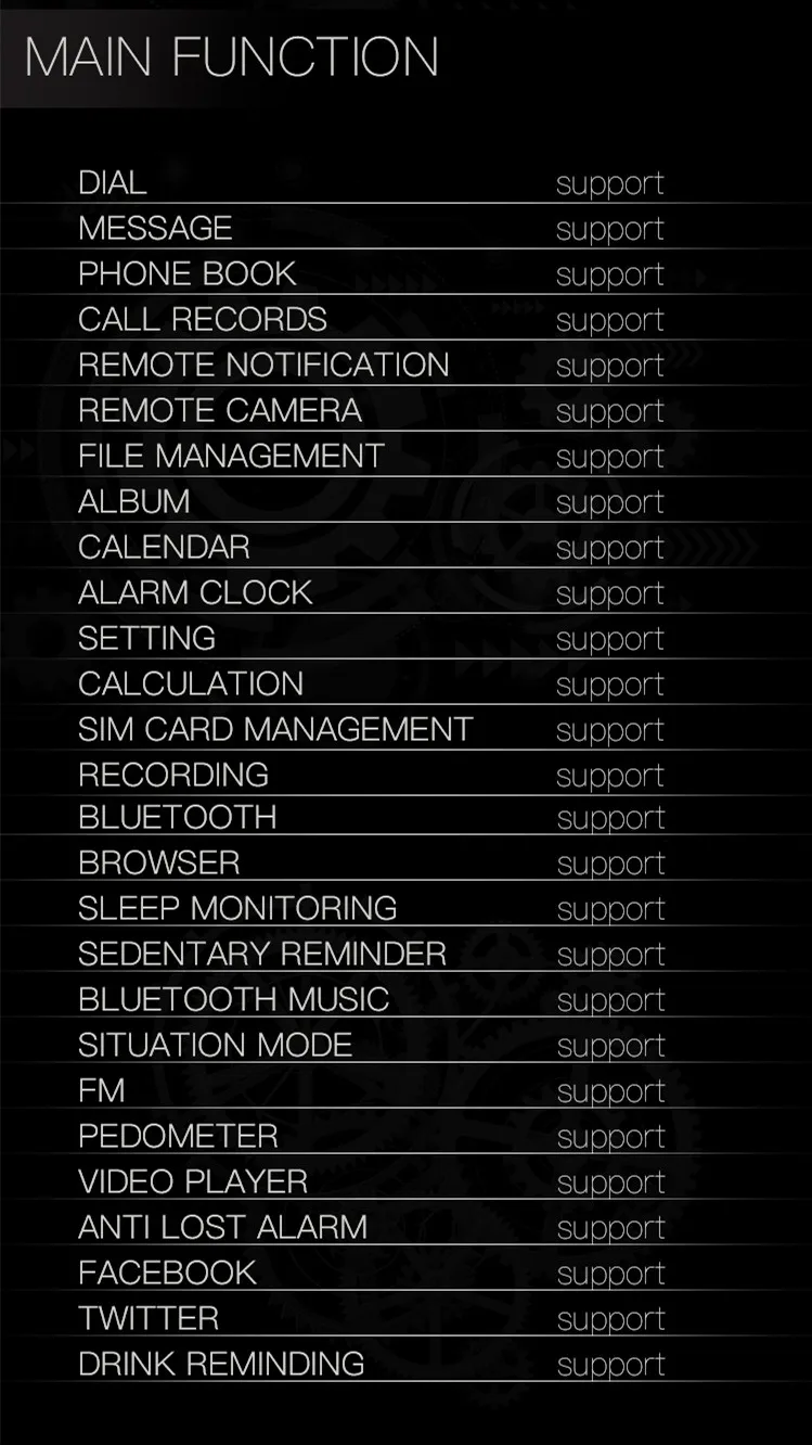 Function:Permanent Calendar,Answer Call,Remote Control,Alarm Clock,Push Message,Passometer,Message Reminder,Sleep Tracker,World Time,24 hour instruction,Call Reminder