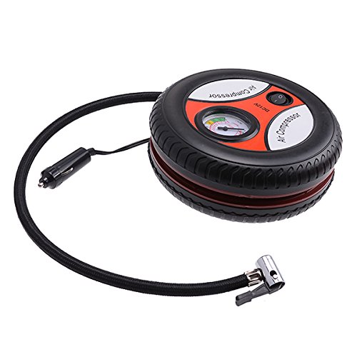 -. Feature : This air compressor is powered by cigarette lighter / DC 12V. / Ideal for inflating tires, balls, bicycles, motorcycles, rubber floater, hovercrafts and so on. / Portable and easy to use,beautiful appearance. / Provide pressure gauge and 3 nozzle adapters. / Will head into 12v DC car cigarette lighter, then rubber tube inserted into the mouth along with the configuration of the steam valve tires can be inflated.