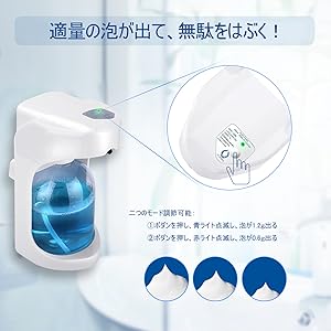 💦ふわふわ泡が出る!:市販の液体ソープと水を入れると(洗剤1に対して水2-5程度の割合でいい)ふわふわもこもこの泡になる、泡ソープは直接にタンクを入れて使えるます。泡の吐出量も2段階切り替え:手洗い用には0.6ml、食器洗い用には1.2mlをススメします。泡がでるのはとっても便利で、お子様も楽に使用できます。