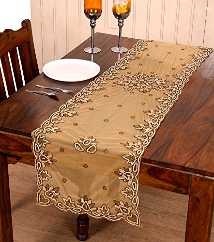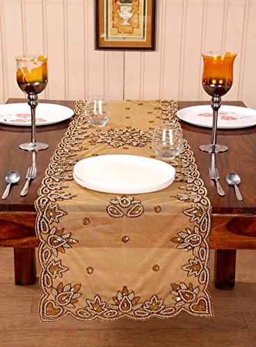 Light & Pro Hand Made Net Beaded Table Runner 16x72 Beige Gold for dining table prepared by skilled village artisans in India