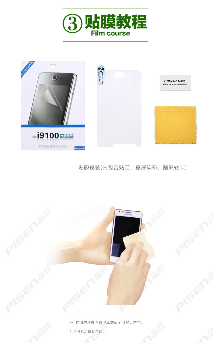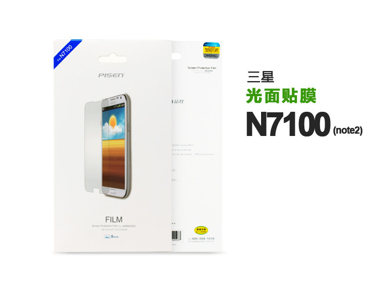 jinBrand: Pisen / product winsModel: Mobile glossy film (Samsung N7100) new versionMaterial: pet filmFeatures: HD fingerprint-proof anti-reflective filmType: Front FilmFor brand: Samsung / Samsung