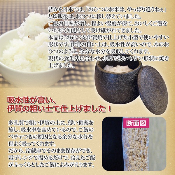 昔から日本では、「おひつのお米は、やっぱり違うねぇ」と炊飯後は、おひつに移し替えていました。ご飯の甘味が増し、程よい湿度が保て、おいしくご飯をいただく知恵として受け継がれてきました。本品は、おひつを伊賀焼で仕上げた小型で使いやすい形状です。伊賀の粗い土は、吸水性が高いので、余分な水分を吸収してくれます。あたためは、そのまま電子レンジでチンするだけで、ふっくらとしたご飯によみがえります。