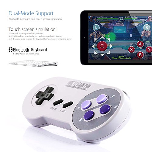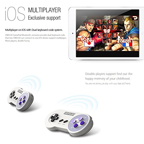 -. Feature : 【Dual Mode Support】Bluetooth keyboard and touch screen simulation. Support both Bluetooth and USB connection. / 【Wide Compatibility】Compatible with iOS, Android, Mac OS, and Windows, and also supports iOS/Android devices, No need to jailbreak or root! / 【Battery Life】 Allows for two players to play simultaneously. Built-in 480mAh li-ion battery supports up to 20 hours of gaming. / 【Portable and Lightweight 】Travel or business trip, SNES-style SNES30 gamepad controller is greate for travel, whether on a trip by car, train or airplane it's easy tocarry. / 【Lifetime Warranty】Package Included: 1 x 8Bitdo SNES30 Game Controller; 1 x USB Cable; 1 x Anniversary Keychain; 1 x User Manual. If you have any questions, please feel free to contact us.