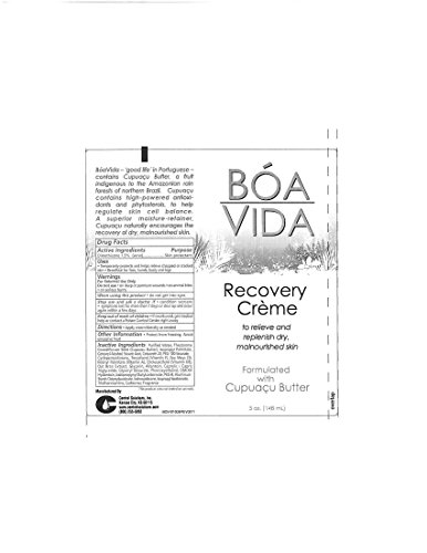 Bov Vida (the good life) Recovery Crème is for daily use on all types of skin. Formulated with a combination of dimethicone & Cupuacu Butter, Recovery Creme has incomparable moisture absorption properties. Among the phytosterols found in Cupuacu Butter are beta-Sitosterol, Stigmasterol, and Campesterol, which help control the balance & activity of the lipids contained in the epidermal (outer) skin layer. Unlike Lanoline and Shea Butter (a member of the nut family), Cupuacu Butter has no known population segment with potential allergic responses - rather, it has been evaluated at length for this hypoallergenic qualities. Non-irritating & non-sensitizing, it helps provide rapid moisture relief & retention. This product was not tested on animals.Feature