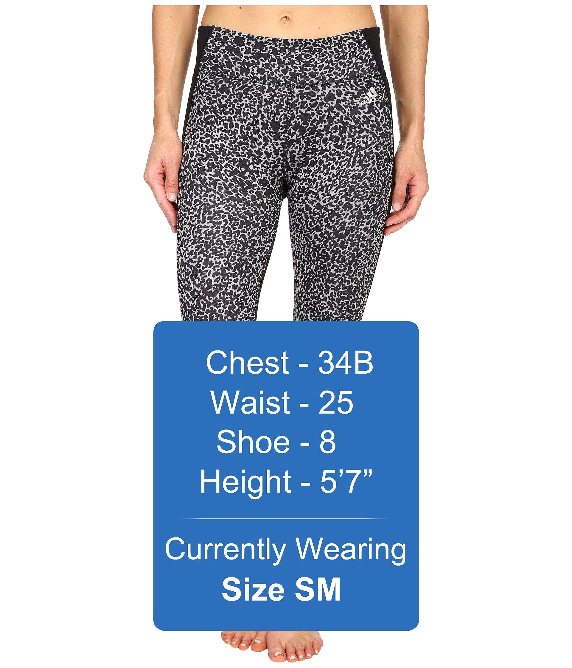| Product Information SKU: #8641134You're a top performer in your class in this adidas? Clima Studio Mid Rise 3/4 Animal Print Tights.adidas? Training apparel pays attention to the details so distractions are eliminated and the focus is purely on the training.Wide fitting elastic waistband.Interior media pocket at waist allows you to store small items. Flat-seam construction provides increased comfort and reduces chafing. Brand mark logo at left hip. 87% polyester, 13% spandex. Machine wash cold, tumble dry low. Imported.Product measurements were taken using size SM, inseam 22. Please note that measurements may vary by size.Measurements: Waist Measurement: 24 in Outseam: 29 in Inseam: 22 in Front Rise: 7 in Back Rise: 12 in Leg Opening: 10 in |