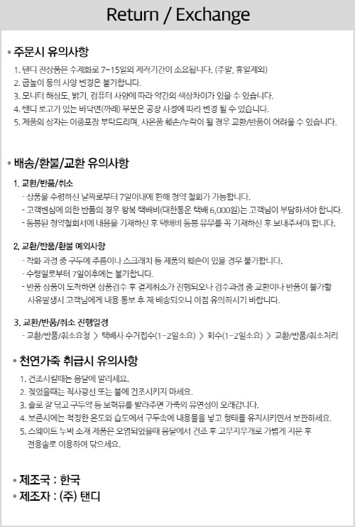 * 사이즈가 품절시에나 그 외 사이즈는 제작이 가능하며 약 7~15일 소요됩니다.