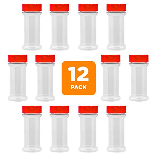 12-Pack Clear Plastic Spice Jars Storage Container Bottle-7 Oz -Flap Cap to Pour or Shaker/Sifter- Pressure Sensitive Liner to store Spice,Herbs-BPA free (12, red caps)