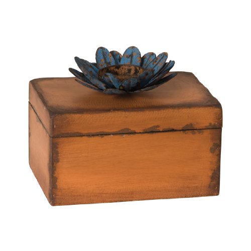 Wilco Imports Rust Brown Distressed Wooden Box with a Blue Metal Flower Tealight Holder