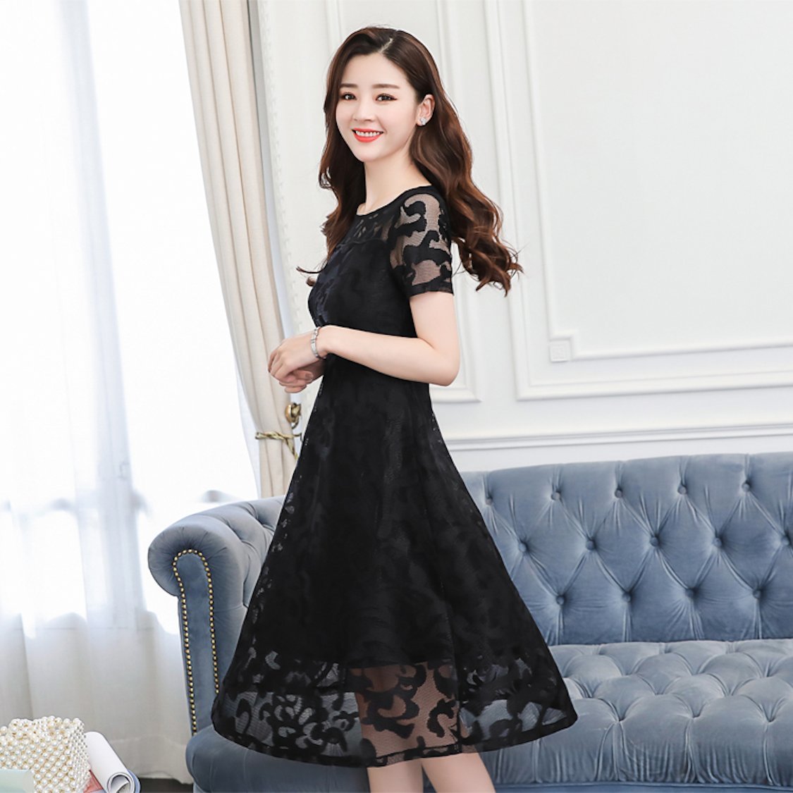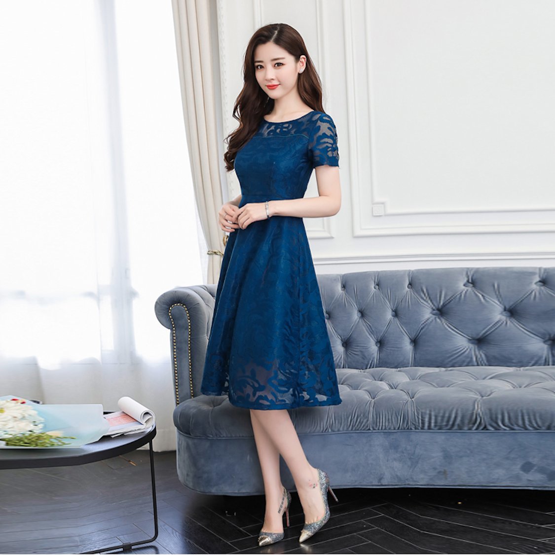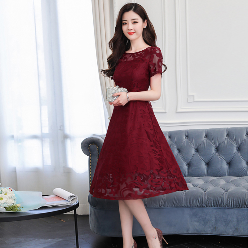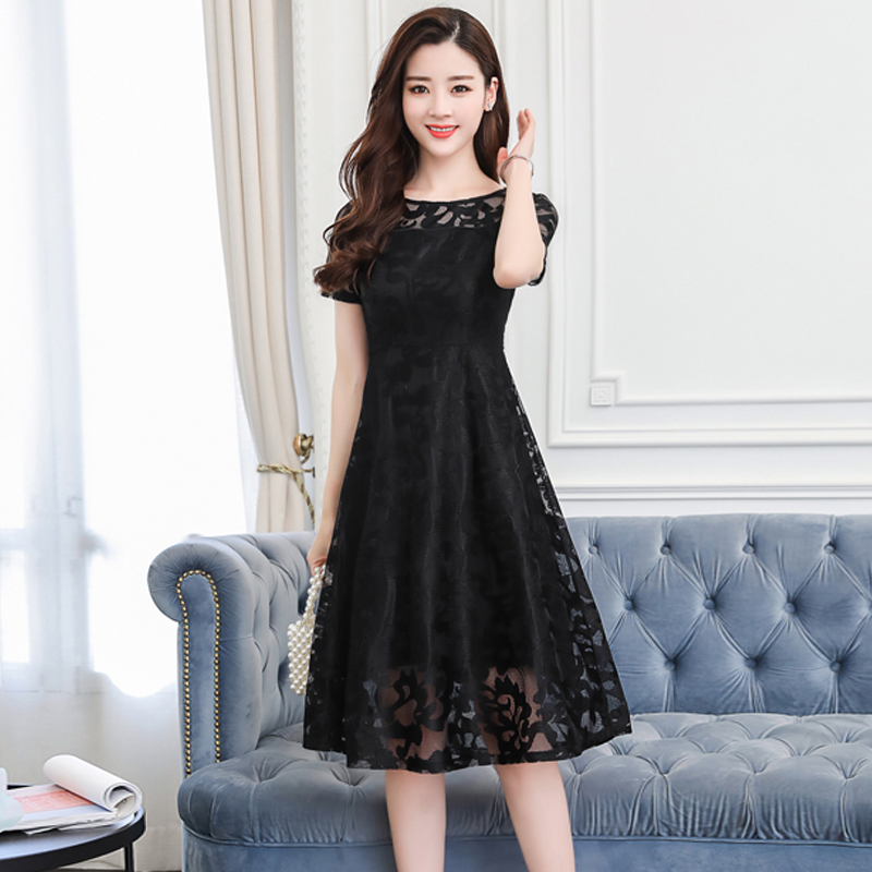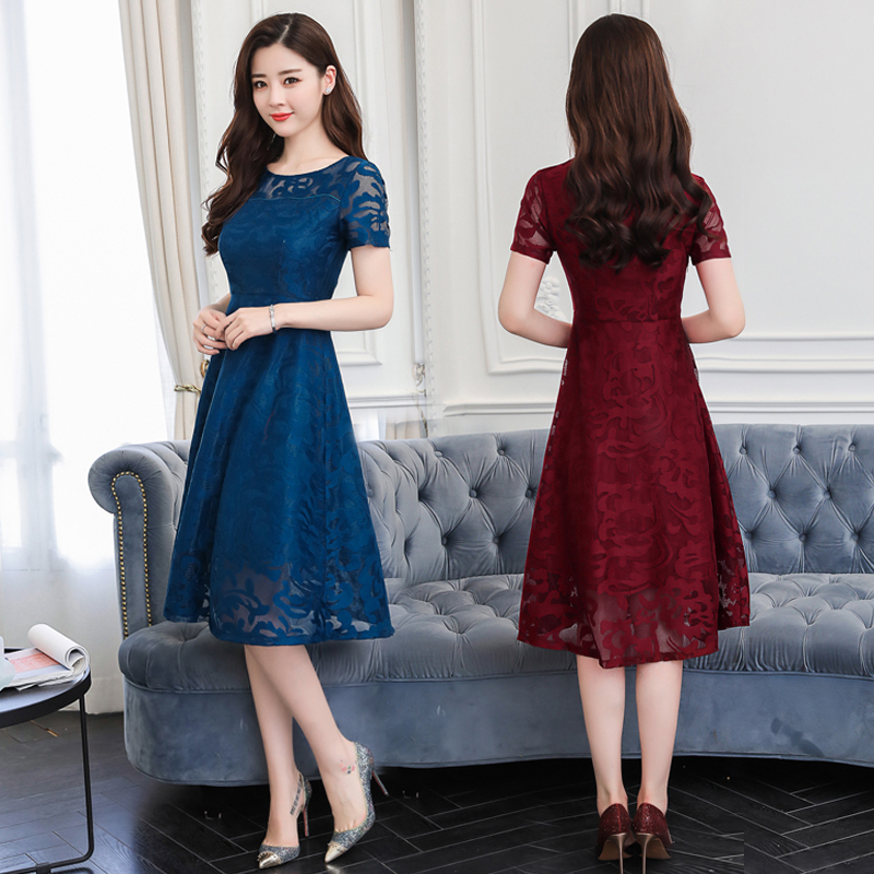花柄レース ワンピース 半袖 シースルー Aライン ミモレ丈 ドレス 春 30代 結婚式 きれいめ 大人女子 メッシュ フレア 夏