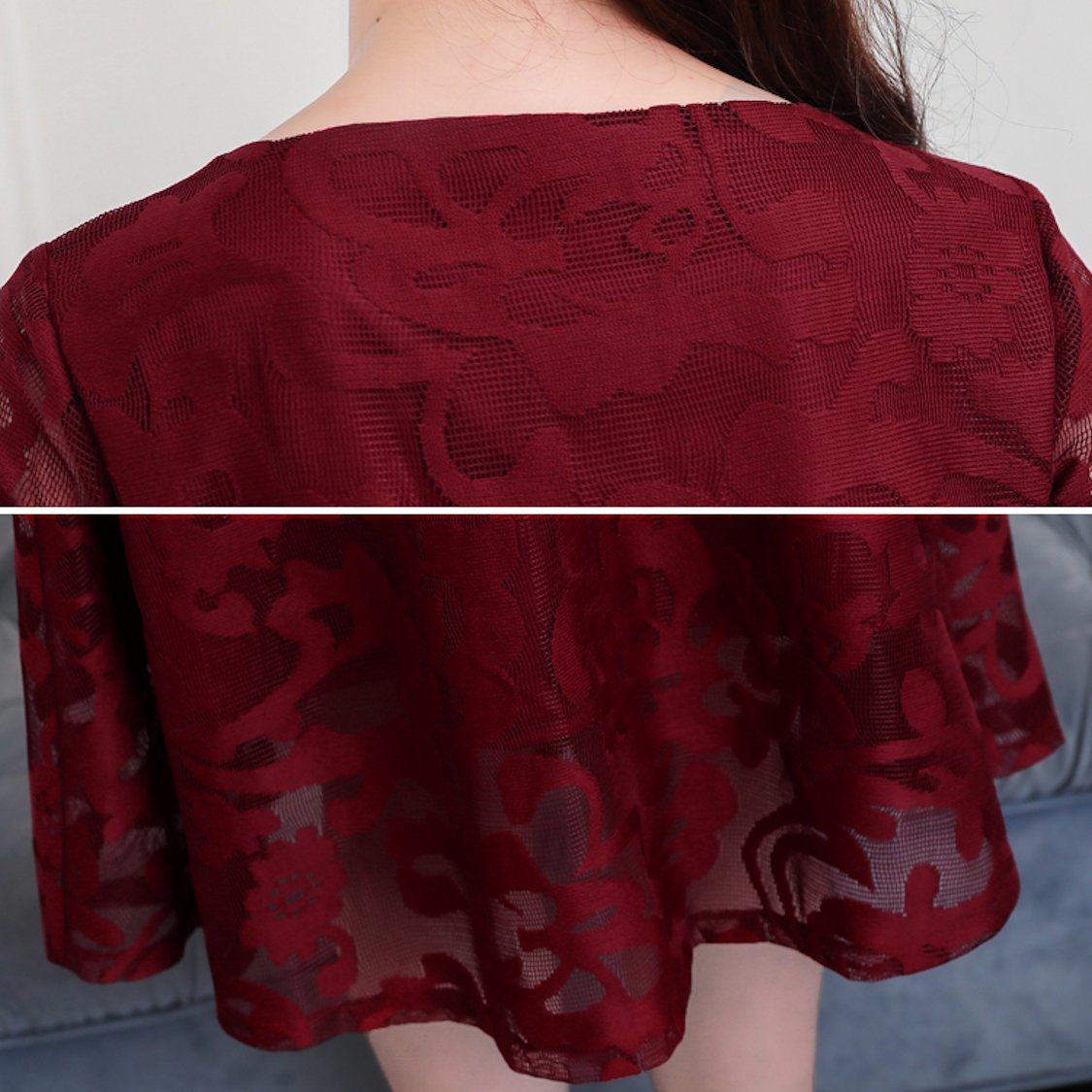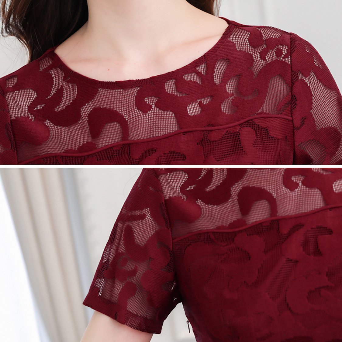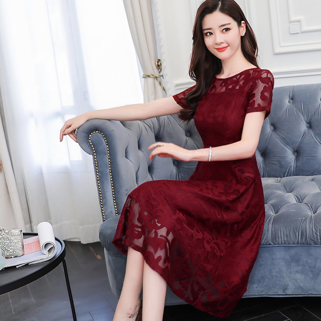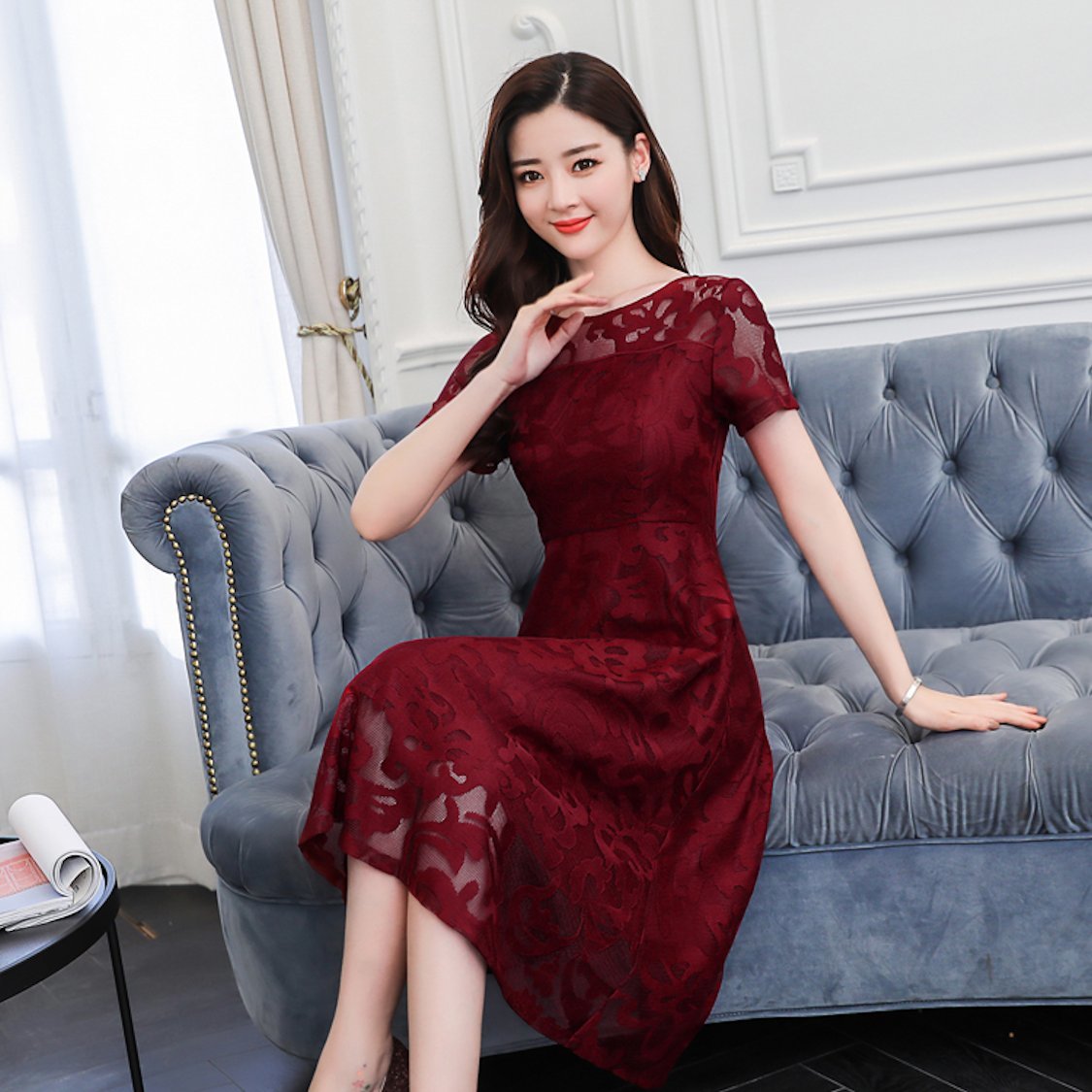 花柄レース ワンピース 半袖 シースルー Aライン ミモレ丈 ドレス 春 30代 結婚式 きれいめ 大人女子 メッシュ フレア 夏