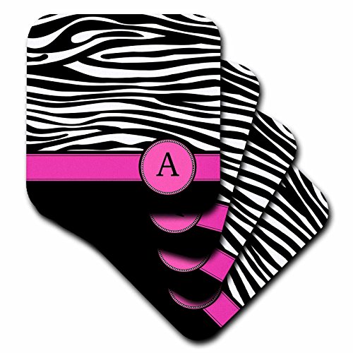 3dRose cst_154272_1 Letter a Monogrammed on Black and White Zebra Stripes Animal Print with Hot Pink Personal Initial-Soft Coasters, Set of 4
