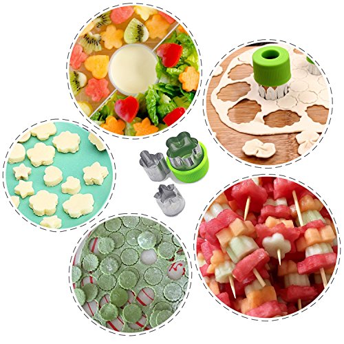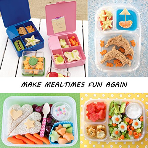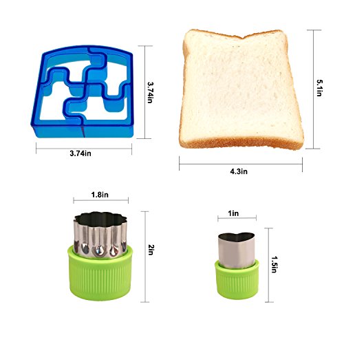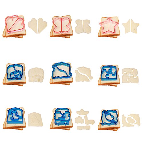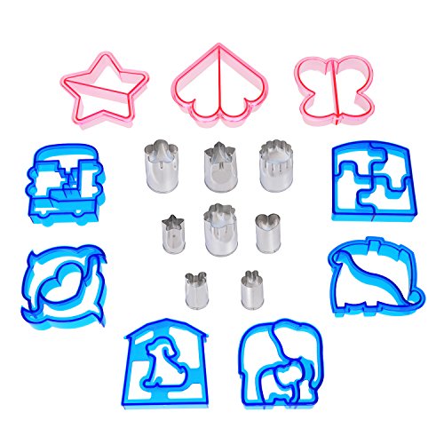 TURN LUNCH INTO FUN SHAPES: 9 sandwich cutters shaped as: Dinosaurs, Puzzle, Star, Elephants, Heart, Dolphins, Cars, Butterfly and Puppy; 8 cookie cutters shaped as: 4 different flower, heart, star, bunny and bear.