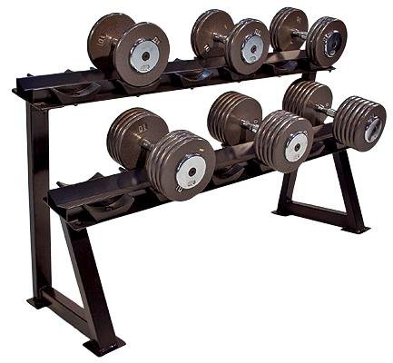 Individual PVC cradles separate and protect dumbbells. Holds 6 pairs, up to 120 lb. size (top rack only). Steel construction. Assembly required. Black. 54-1/2" L x 20-1/2" W x 32" H. Ships in 2 boxes. Dumbbells sold separately.