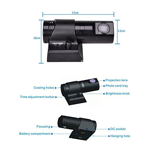★ 180-degree rotational projection, Stepless brightness adjustment. ★ Lamp: Cree XM-T6 LED 5W. ★ Power: DC 5V/2A ( adapter AC 110V-240V 50/60HZ ). ★ Brightness: 200-1000LM adjustable. ★ Color Temperature: 5000K-8000K. ★ Movement: Digital. ★ Powered by: DC Input. ★ Product Dimensions: approx 17cm x 7.2cm x 10cm. ★ Projection Distance: 1.5m-5m. ★ Use of 5W High brightness LED light source, low temperature cold light source, a over-length life(40000 hours), green energy conservation. ★ High-precision clock mechanism, LCD display, simple and easy single-button timing. ★ The classic pointer clock or a digital display dial pointer clock, digital Rome and other clock dial. ★ Projection distance of 1.5 meters to 5 meters( Such as the ambient light is dark, the projection distance can be greater).