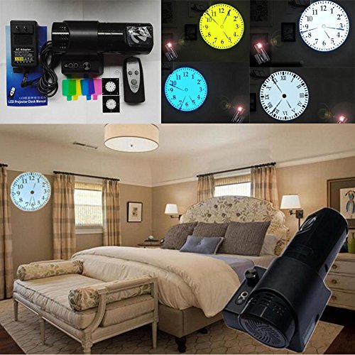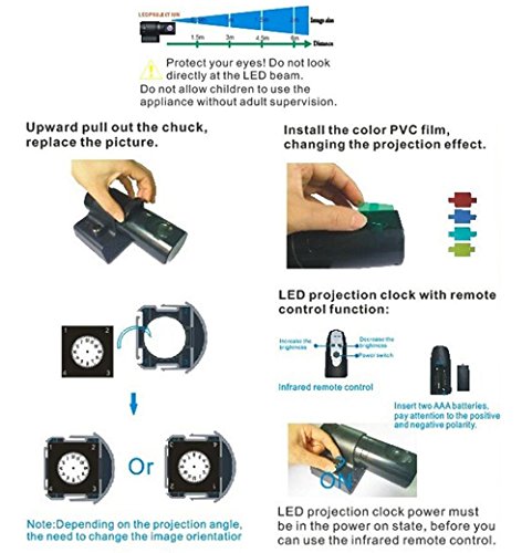 Package included: 1x Projection Clock. 4x Color Card. 1x Adapter. 1x User Manual. 2x Clock Dial Card ( Arabia number Roma, you can exchange it according to your prefer). 1x Remote Control(Power by 2x AAA battery,The battery DO NOT include).