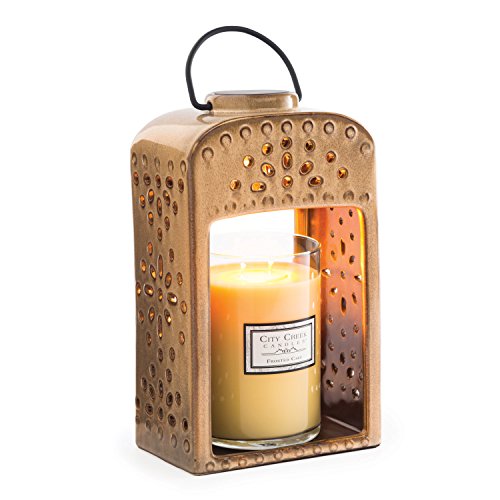 -. Feature : PIERCED AND BEAUTIFULLY CRAFTED - Candle Warmers Pierced Ceramic Candle Warmer Lantern an arched design pierced with a sunburst pattern; The reactive sandy glaze with dark ages adds to its dimension / NEW AND IMPROVED WAY TO BURN YOUR FAVORITE SCENT - Candle Warmers Pierced Ceramic Candle Warmer Lantern uses our patented top-down warming technology and includes a warming bulb; Enjoy the ambiance, glow and fragrance of a candle without the danger of an open flame, soot, or smoke that comes from burning a candle / PERFECT SIZE FOR YOUR COUNTER - Candle Warmers Pierced Ceramic Candle Warmer Lantern is 6.45 inches by length, 4.43 by width, 10.52 inches by height and weighs 2.25 pounds; space for candle from height to base is 6 inches and the candle indentation from inside the wall width is 3.88 inches by 5.30 inches / FITS PERFECTLY TO YOUR FAVORITE SCENTED CANDLES - Candle Warmers Pierced Ceramic Candle Warmer Lantern fits 22 ounces or smaller candles; A space-friendly addition to your home decor / ELECTRIC WIRING AND BULB REQUIREMENT - Candle Warmers Etc. Tin Punched Candle Warmer Lantern uses Rocker Switch, a NP5 Candle Warmers Etc. replacement bulb and an electric rating of 120V, 60Hz, 25W; Your security is always a number one P.R.Iority
