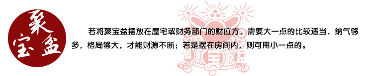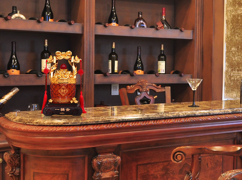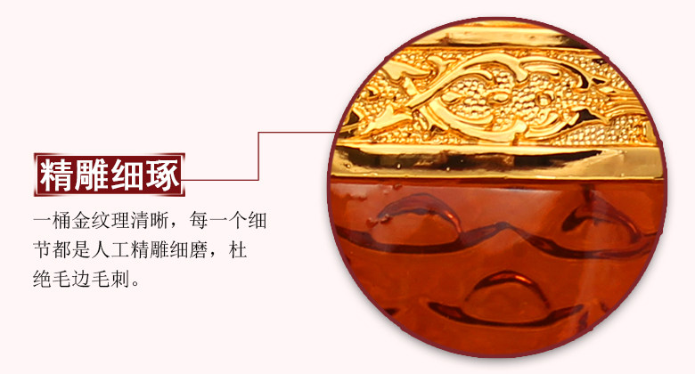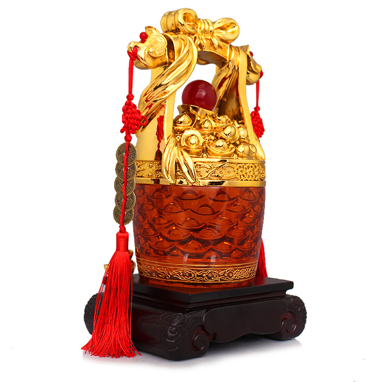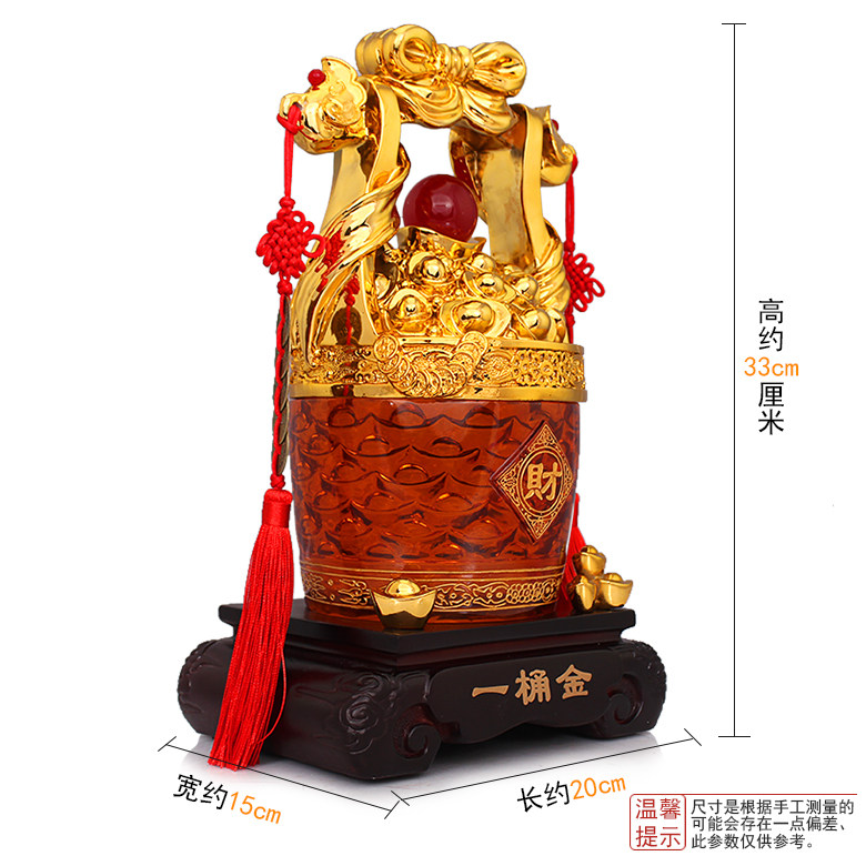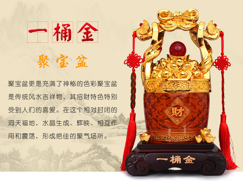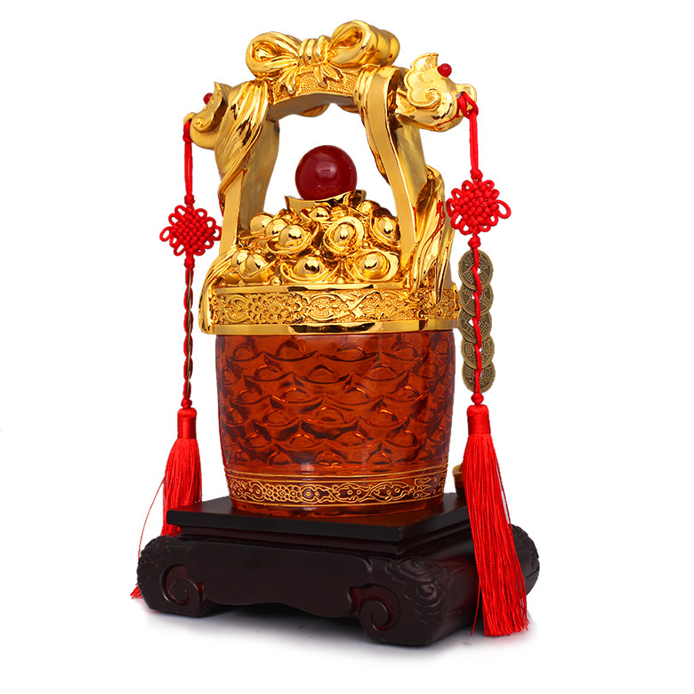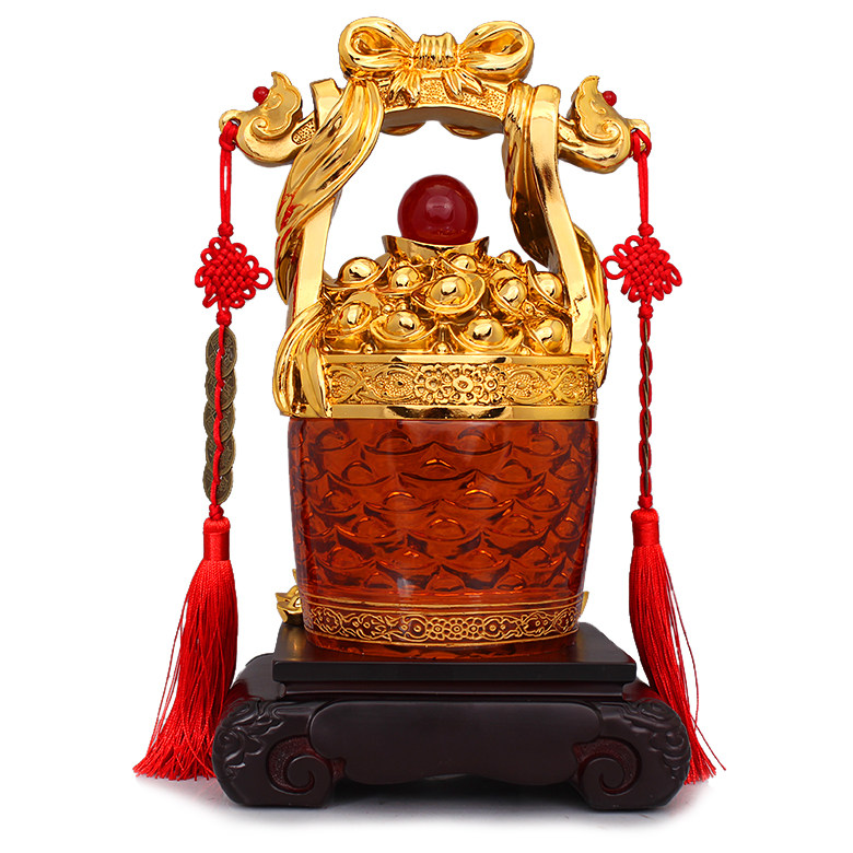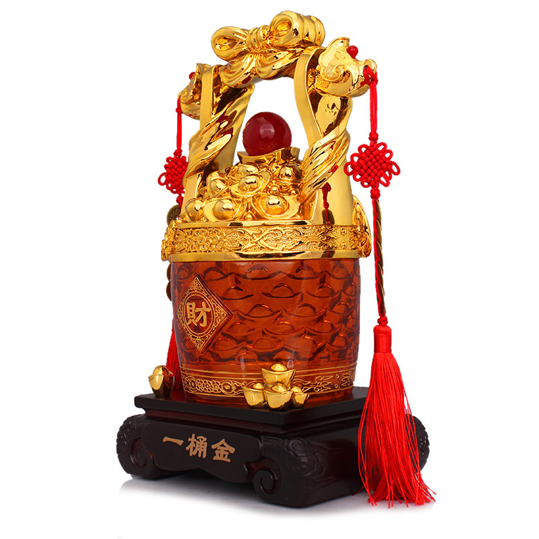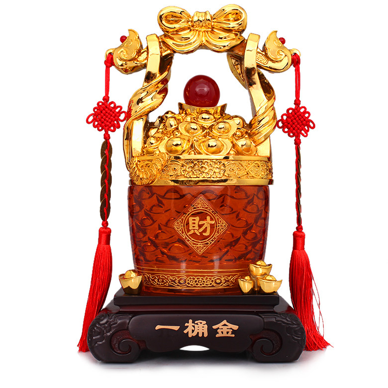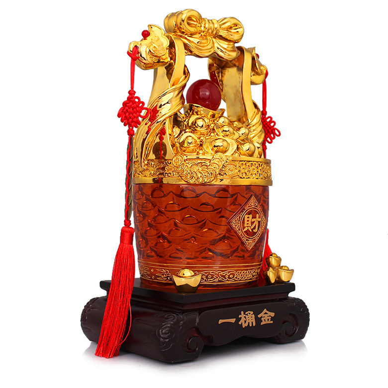 桶是盛水用的,水为财。金,自古就是淘出来的,而桶就是淘金最好的盛装器具,一桶,其份量非同一般如碗、盆、瓶等之类,一桶金是一笔巨大的财富,是事业腾飞的基础。桶是日常所见的,它总是满满的从外面担进去,空着出来,所以桶又是聚财之物。"满"和"福"两字刻于桶壁,吉祥祝福之意不言而喻。