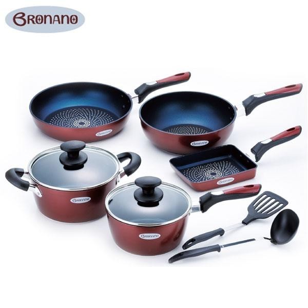 | セット内容 | 片手鍋18cm、両手鍋20cm、フライパン26cm、ディープパン24cm、玉子焼13×18cm、ナイロンお玉、ナイロンターナー、取扱説明書 |