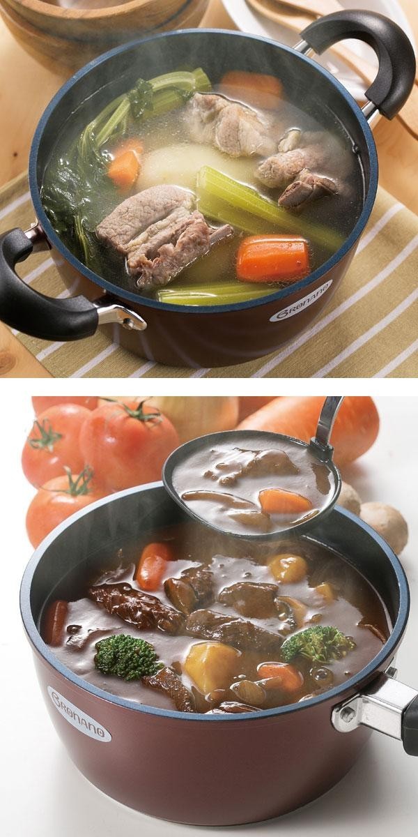| 仕様 | ガス・IH(200V)対応 容量/片手鍋:約2.1L、両手鍋:約2.9L、ディープパン:約3.1L 食洗機不可 電子レンジ不可 内面:ふっ素樹脂加工(ダイヤモンドコート+プリント) 外面:焼付塗装 |