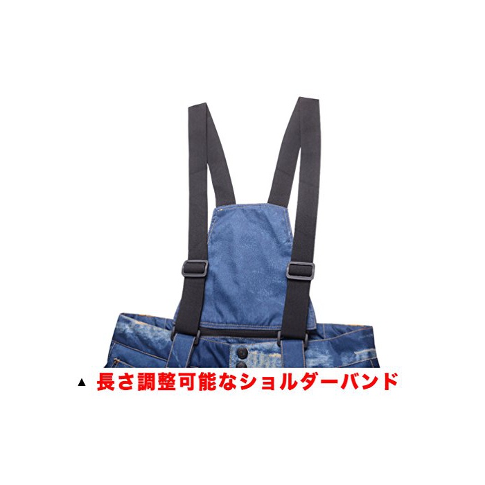 마치 빈티지의 데님 진즈와 같은 스노우 팬츠.스노보드,스키에.팬츠형과 overalls형의 2WAY사양입니다.데님 모양은 프린트로,데미지풍 부분 등은,화상과 약간 다른 경우도 있습니다만,미리 양해 바랍니다.