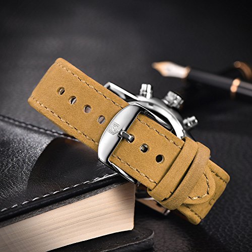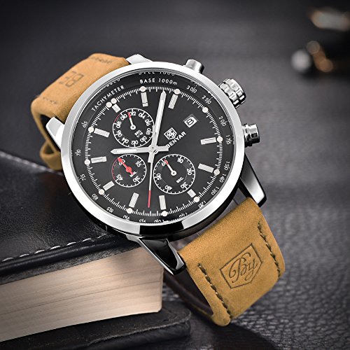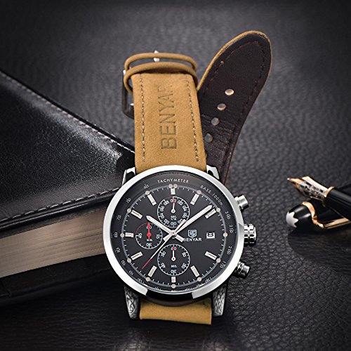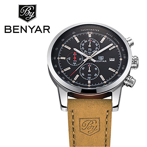 Brand, Seller, or Collection Name:BENYAR Part Number:H001 Item Shape:Round Display Type:Analog Case diameter:43 millimeters Case Thickness:0.48 millimeters Band Material:Genuine Leather Band width:22 millimeters Band Color:Brown Dial color:Black Calendar:day date Special features:Chronograph Movement:Japanese quartz