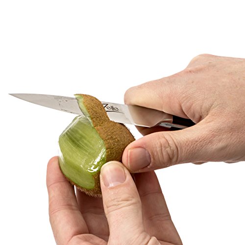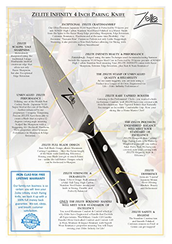 - Feature : SETTING THE NEW STANDARD FOR PARING KNIVES >>> Impress Guests with your Visually Stunning, Extreme Performance Premier Paring Knife adding Refinement and Style to any Modern Kitchen! Minimal Slicing Resistance, Satisfying Heft, Full Tang & Premium Materials! / PREMIUM JAPANESE STEEL - RAZOR SHARP >>> Imported Japanese Takefu VG10 Super Steel with 67-layer High Carbon Stainless Steel - our Knife Paring is Non-Stick, has an Exquisite Tsunami Rose Damascus Pattern and is Liquid Nitrogen Tempered ensuring Long Lasting Performance! Stain & Rust Resistant / STUNNING TRIPLE RIVETED, ROUNDED HANDLE >>> G10 Handle Triple Riveted to the Full Tang for Extra Strength & Durability, Tastefully Adorned with the Zelite Infinity 3-Metal Mosaic Rivet. Ergonomically Designed Rounded Handles to ensure a Secure and Comfortable Grip! RARE Tapered Bolster for Extreme Comfort, Perfect Balance VG-10 Knife / BEST VALUE, PREMIUM PACKAGING, UNRIVALLED PERFORMANCE >>> Don't compare on Price, You get what you Pay for! 12-15 Degrees Razor Sharp Edge for Maximum Sharpness & Safety. Mincing Herbs, Slicing Fruit, Peeling Vegetables, Cutting Cheese & More are Precision Sliced. No tearing or squishing, only Ruthless Efficiency, Every Time! Get ready to feel like the Master Chef's do on a Cooking Show / RISK FREE LIFETIME GUARANTEE - WARRANTY >>> 100% Satisfaction or your Money Back, No Questions Asked. Our Paring Knifes have been built with Perfection in Mind. Ideal Gift for Weddings, Birthdays, Special Treats for Loved ones and more... You can't lose. Limited Supply, Order Now before they are Sold Out! You Deserve this!