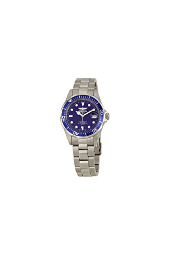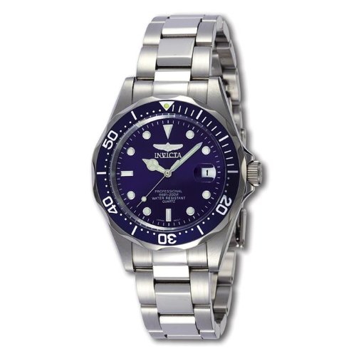 Amazon.com Product Description With the affordable silver-tone Invicta Pro Diver SQ quartz men's watch, you can still afford to buy flippers and a pair of goggles. It features a shock-resistant, Japanese quartz movement that will stand up to the rigors of your undersea adventures, and it's water resistant to 200 meters (660 feet). It's topped by a blue-plated unidirectional rotating bezel with elapsed time markings in silver and scalloped edges for a firm grip even with diving gloves. The blue dial includes large Tritnite luminous markers and hands (with seconds hand) and a date window at 3 o'clock with a magnifier. Other features include a fold-over clasp with safety and an anti-reflective mineral crystal. Pro Diver Collection Plunge into any horizon using the steadfast guidance of the Invicta Pro Diver. Stylishly classic, internal workings are forged with variations of either Swiss chronograph or 21-jewel automatic movements and willingly navigate in depths up to 300 meters. Built with confident prowess, the fortitude with which these timepieces function makes the Pro Diver the quintessential in performance. 0