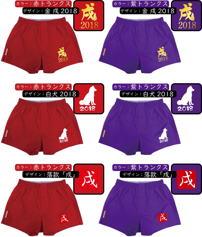 実用性ある縁起の良い戌年の赤い男性用トランクスです。赤と紫どとらかのカラー選択してください。デザインも3つから選べます。【重要!】発送方法でメール便をされた場合、ボックスパッケージから袋パッケージに変更になりますことをご了承ください