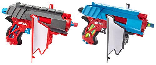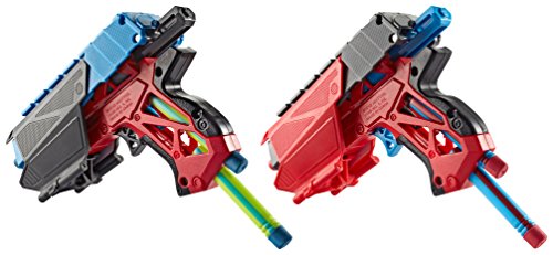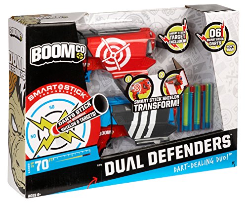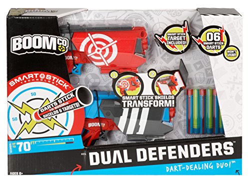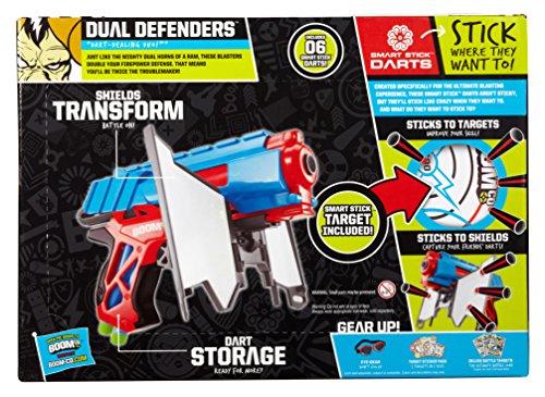 -. Feature : Two single-firing blasters in two designs for twice the action! / Single-fire accuracy for blasting up to 70 feet / Storage for two additional darts in the handle / Removable transforming Smart Stick shields / Includes 6 Smart Stick darts and a Smart Stick target