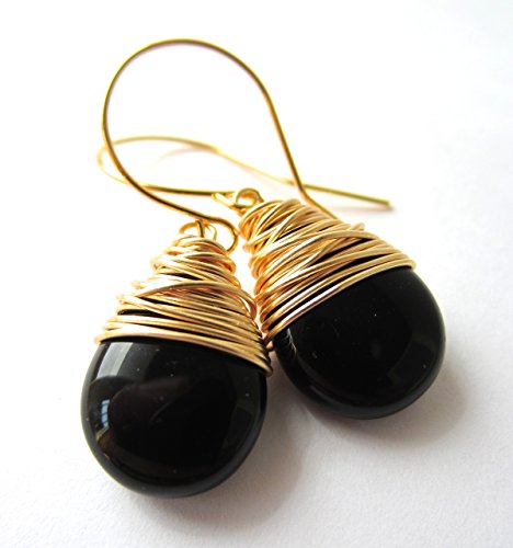 -. Title : Black Drop Earrings Wire Wrapped Czech Glass Drops Gold Tone