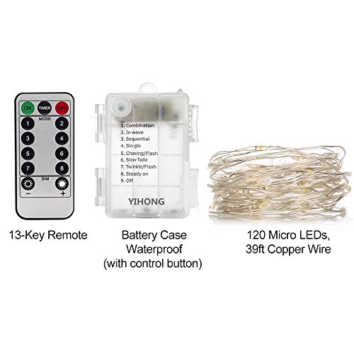 Terrific Decorating & Crafting Tools -- The daylight white Fairy Lights is battery powered with 39 feet moldable copper wire and 120pcs glowing micro Leds;comes with a remote to control the light wirelessly. You can use them to decorate your wedding ceremony, Halloween party; DIY unique dinner party centerpiece;apply for your crafting project;making twinkling bonsai/plants arrangement.