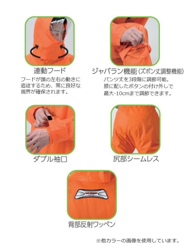 | 耐久性に優れた生地のレインウェア。 |