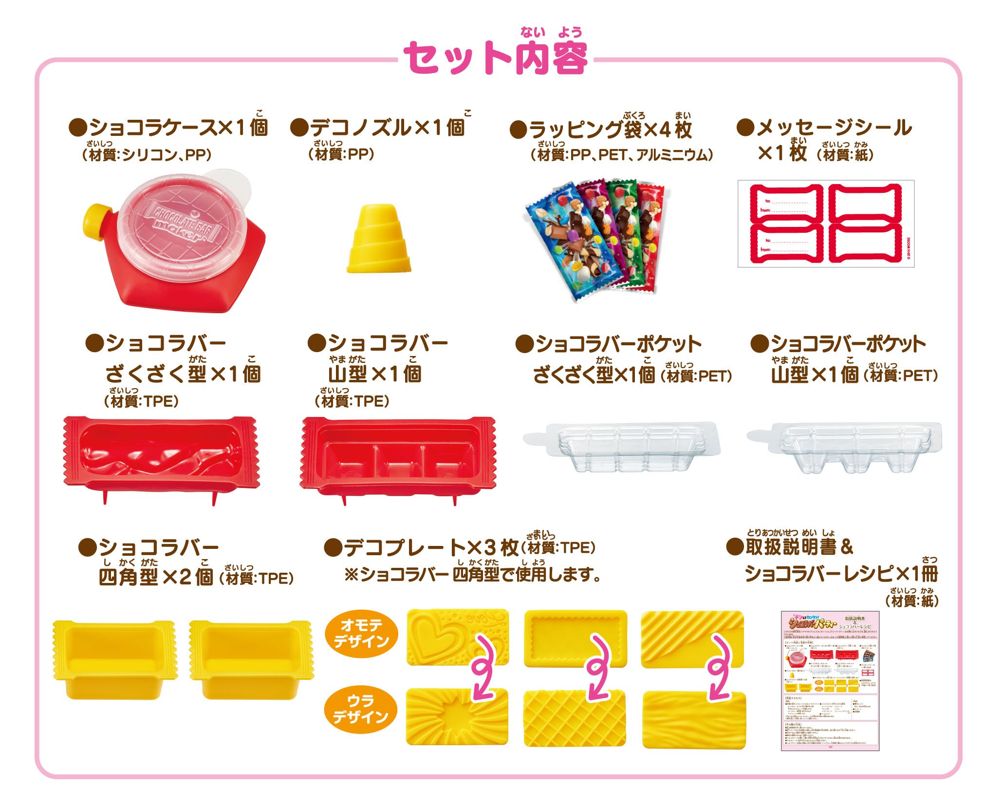 Chocolat case × 1, chocolate bar type × 4, chocolate bar pocket × 2, deco plate × 3, deco nozzle × 1, wrapping bag × 4, message seal × 1, instruction manual (recipe) × 1