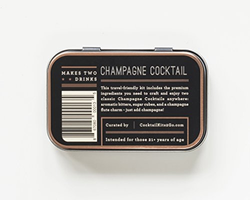 Studio : Cocktail Kits 2 Go Publisher : Cocktail Kits 2 Go Product Description Travel-friendly cocktail kit includes the premium ingredients and instructions you need to craft and enjoy two Champagne Cocktails anywhere. Whether you want to bring the kit with you as a carry on during your next flight, surprise your colleague with a classy gift or impress your friends with fine drinks at your next social gathering, Cocktail Kits 2 Go has you covered! The Champagne Cocktail drink kit includes: 1) Cocktail instructions. 2) Carry on travel tin. 3) Aromatic bitters. 4) Sugar cubes. 5) Champagne flute charm. 0