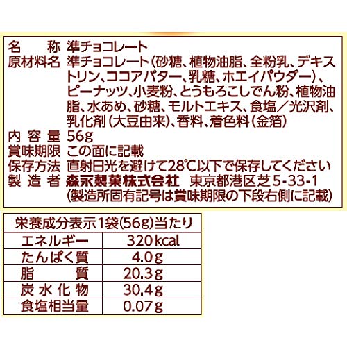 原材料:準チョコレート(砂糖、植物油脂、全粉乳、デキストリン、ココアバター、乳糖、ホエイパウダー)、ピーナッツ、小麦粉、とうもろこしでん粉、植物油脂、水あめ、砂糖、モルトエキス、食塩/光沢剤、乳化剤(大豆由来)、香料、着色料(金箔)