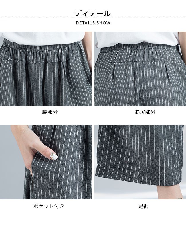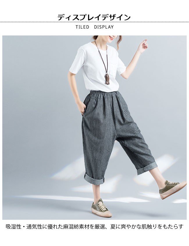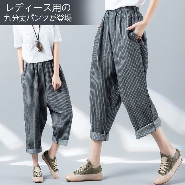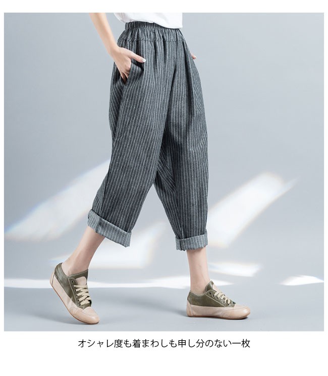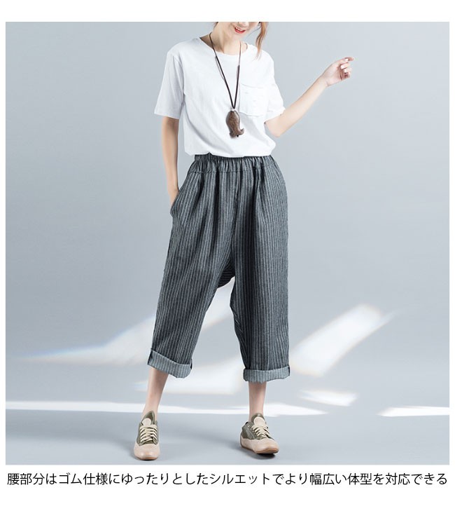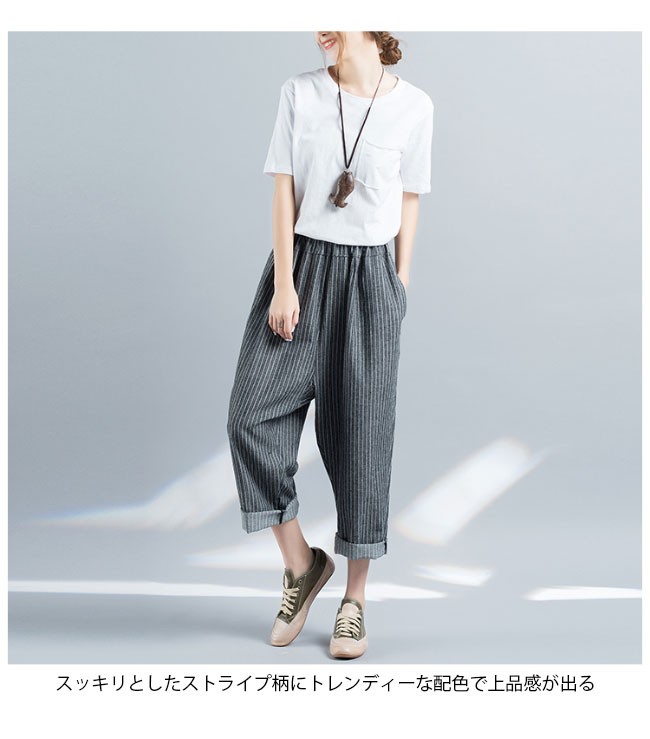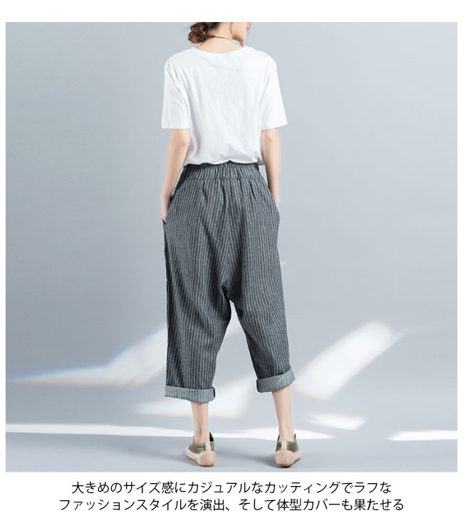 サルエルパンツ 九分丈 レディース ストライプ柄 ウエストゴム ゆったり 女性用 リネン 九分丈パンツ 体型カバー 夏物 ボトムス カジュアルレディース用の九分丈パンツが登場吸湿性・通気性に優れた麻混紡素材を厳選、夏に爽やかな肌触りをもたらすスッキリとしたストライプ柄にトレンディーな配色で上品感が出る大きめのサイズ感にカジュアルなカッティングでラフなファッションスタイルを演出、そして体型カバーも果たせる腰部分はゴム仕様にゆったりとしたシルエットでより幅広い体型を対応できるオシャレ度も着まわしも申し分のない一枚カラー:写真色素材 麻混紡サイズ(cm) M XLM 総丈89 ヒップ124XL 総丈89 ヒップ130ご注意:※サイズは平置きサイズです。素人採寸ですので、若干の誤差がございます、ご了承ください。