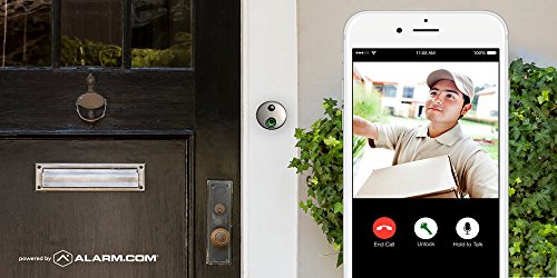 The Alarm.com Skybell Wi-Fi Doorbell Camera is a doorbell with an integrated camera, PIR motion sensor, digital microphone and speaker, enabling homeowners to answer the door, speak to visitors via two-way audio, record doorbell triggered clips, and set motion triggered automation rules -- all right from their Alarm.com app. You will always know who is at the front door. Specifications: Video Camera: 1080p/720p resolution, 180 degree view, auto-scaling, full-color. Night Vision: Full-color night vision. Audio: Omni-directional microphone. Motion Sensor: Detects motion up to 8 feet range Battery Life: 3 to 5 years Dimensions: 2.8 inches/7.1 centimeter wide, 0.9 inches/2.2 centimeter deep, 1.9 ounces/53.8 gram weight. Environment: Outdoor use, operating temp -40F/-40C to 140F/60C, 0-100percent condensing, water resistant.Feature