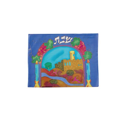 - Rich blue silk, Shabbat candlesticks and grapes for the Kiddush wine provide a backdrop for the Jerusalem view captured on this magnificent painted silk Challah Cover. A stunning addition to your Shabbat table!