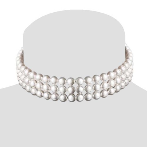 -. Feature : Simulated Pearl Choker Necklace / Rhodium Plated Base Metal / Three strand style / Measure: 13 inch L x 0.98 inch W