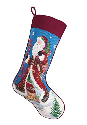 Old World Style Santa Claus with Gifts on Blue Christmas Stocking, Wool & Velvet Needlepoint, 11 Inch X 18 Inch