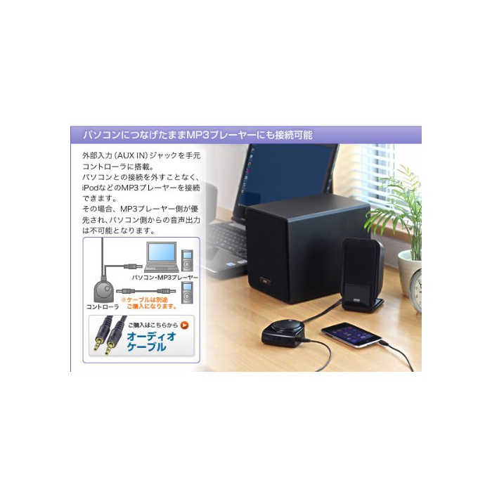 iPhoneiPod를 접속 할 수 있는 외부 입력(LINE IN)잭을 눈앞 콘트롤러에 탑재.메인 음소리는 PC 측에 접속한 채로 i Pod등MP3플레이어를 접속하여 MP3플레이어용 스피커로 해 동시에 이용할 수도 있습니다.