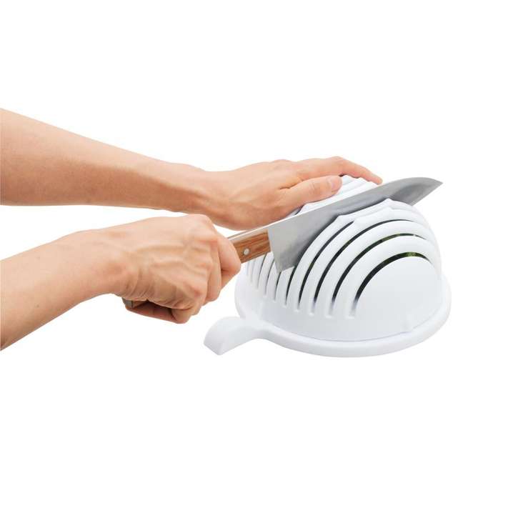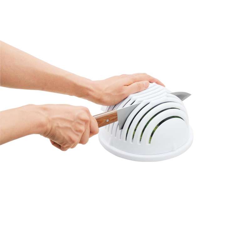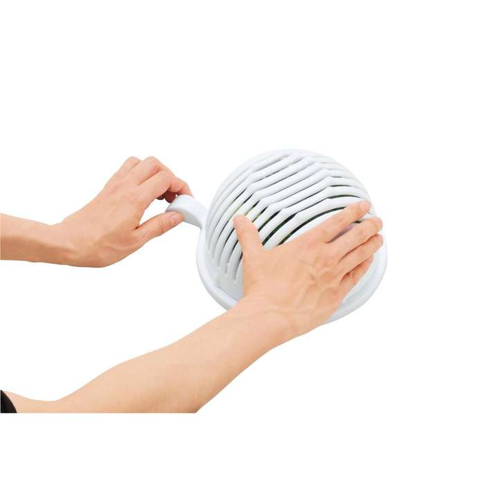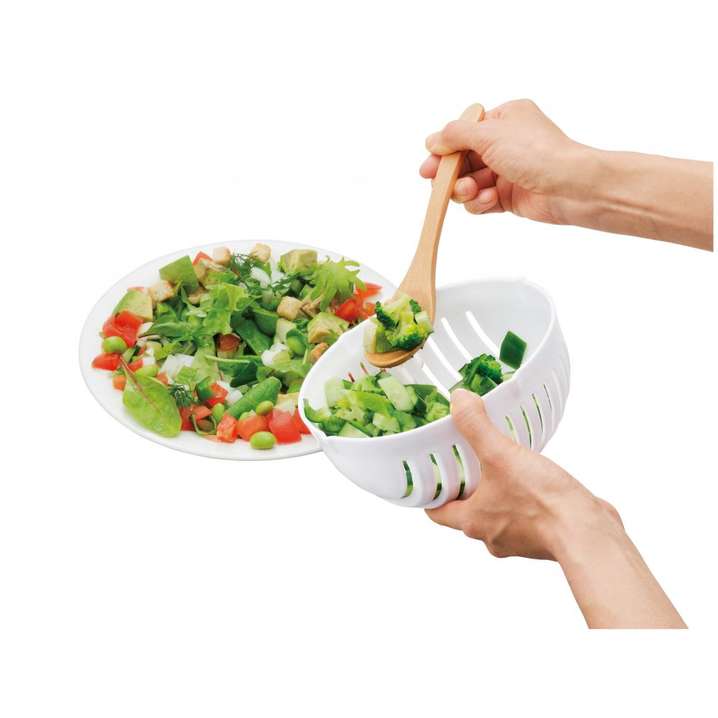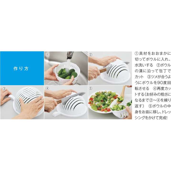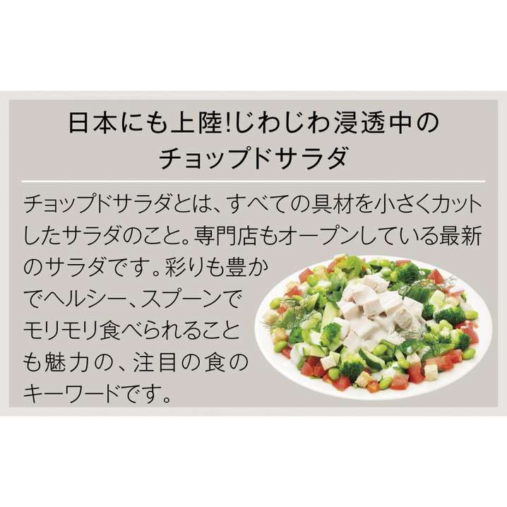 ●お好みの具材をボウル部分に入れて水洗い、あとは回転させながらお好みの粗さになるまでガイドに沿ってザクザク切れば、あっという間にチョップドサラダが完成♪スプーンでもりもり食べられる、今話題のサラダをおうちで楽しもう!訴求力の高いパッケージも魅力的。