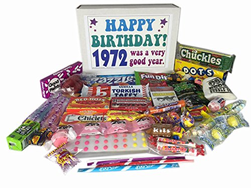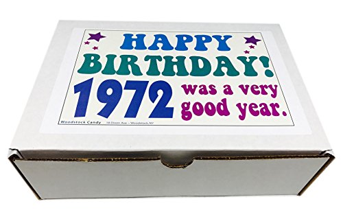 -. Binding : Misc. -. Brand : Woodstock Candy -. Feature : Contains 30 different kinds of retro nostalgic candy / 45th birthday gift box will bring back great childhood memories / Makes a fun and unique gift for any candy lover / Perfect for someone who has everything / Box measures 9.5 x 7 x 3 inches and comes shrink wrapped -. IsAdultProduct : 0 -. Label : Woodstock Candy -. Manufacturer : Woodstock Candy -. PackageQuantity : 1 -. ProductGroup : Grocery -. ProductTypeName : GROCERY -. Publisher : Woodstock Candy -. Studio : Woodstock Candy -. Title : 45th Birthday Gift Box Retro Nostalgic Candy - 45 Years Old - Born in 1972 '70s Jr