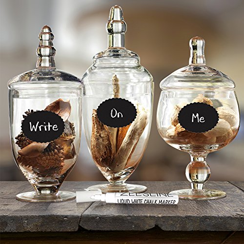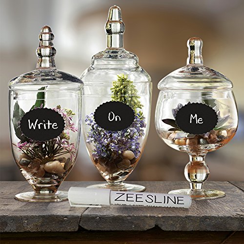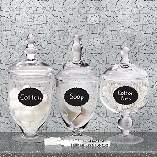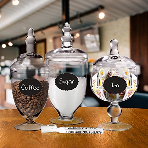 - Feature : Adorable set includes 3 hand blown apothecary jars with chalk labels and marker. / Ideal to use as a wedding centerpiece, candy buffet, decorative display or to hold your bathroom stuff. / Dimensions: Large - 4.75 D X 8.5 H, Medium - 4.5 D X 11 H, Small - 4 D X 9.5 H. / Add a personal touch to any decorating or organizing project with the included labels and marker. / Wipe clean the labels with a damp cloth to reuse.