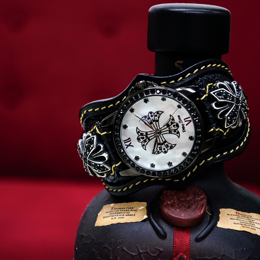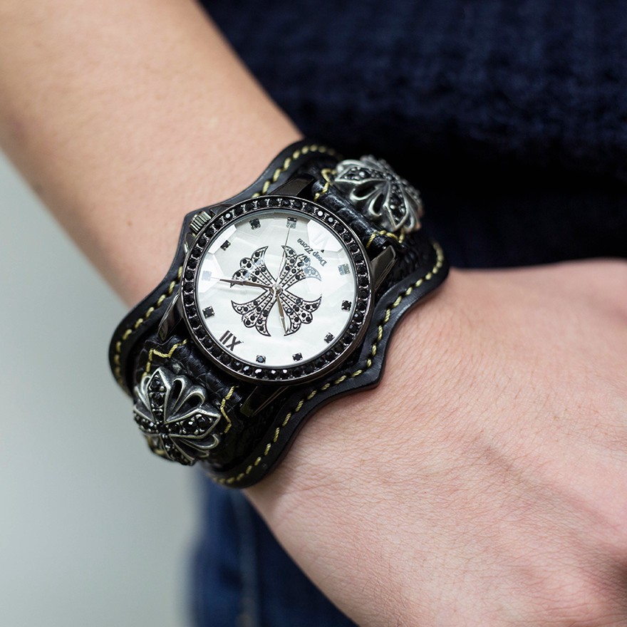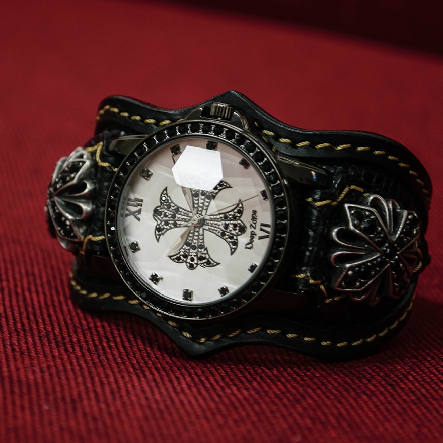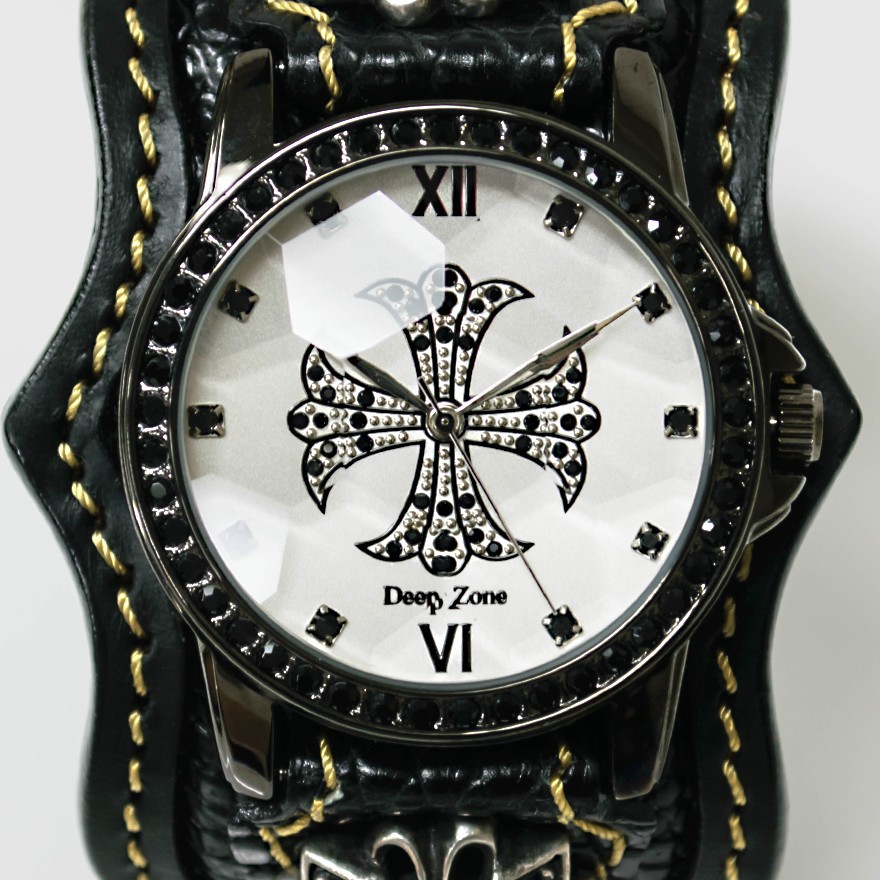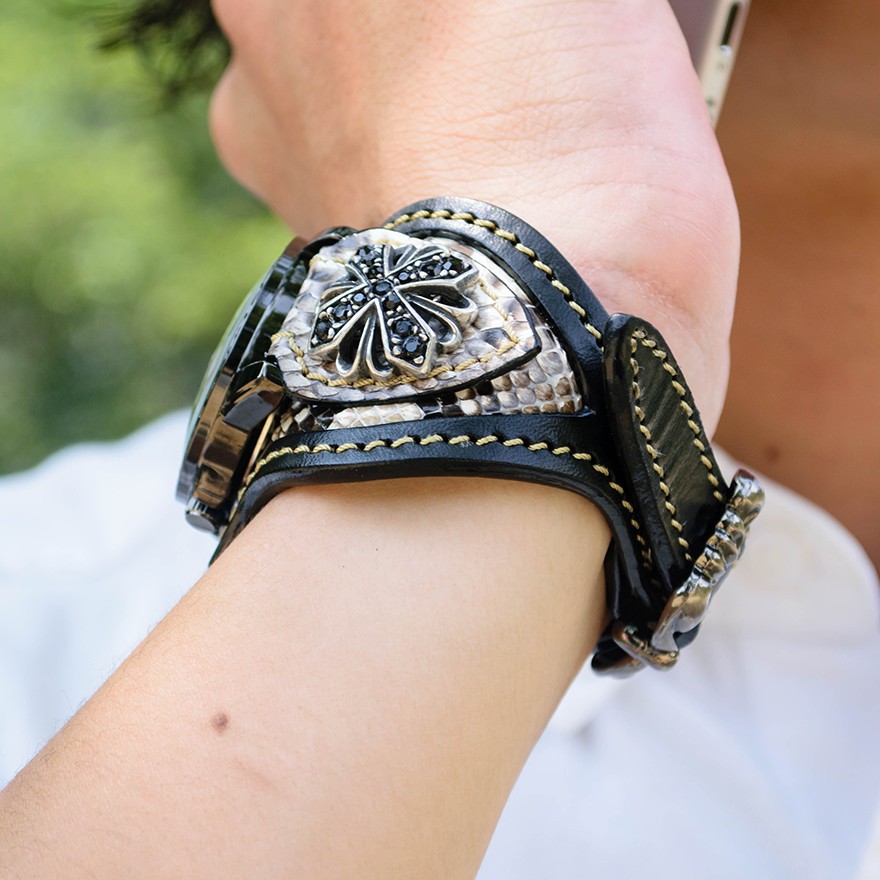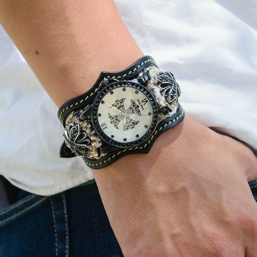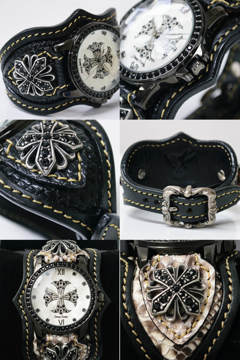 リアルパイソンレザーとサドルレザーと組み合わされ、 丁寧に縫製仕上げされたベルト。[Deep Zone]オリジナルムーヴメント、数多くのジルコニアが埋め込まれたクロスデザインフェイス!独創的デザインレザーブレスウォッチに仕上がっています。自分用にまたはプレゼントとしてもオススメです。◆ ケースサイズ : 38mm × 8mm◆ 素材:ステンレス◆ ムーブメント:国産◆ 防水…日常生活防水 ◆ 保証書付◆ 有効着用サイズ:約16cm~19cm◆ レザーブレスウォッチ専用ケースMOVIE