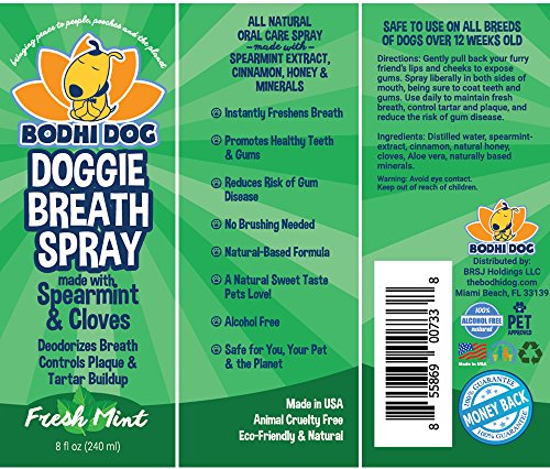 Our great tasting all natural Doggie Breath Spray makes freshening your dog's breath and caring for your dog's teeth and gums simple, easy and delicious! Use our great tasting breath spray to tackle offensive doggy breath while providing preventative oral care - its a win win! To use, gently pull back your furry friend's lips and cheeks to expose gums. Spray liberally in both sides of mouth, being sure to coat teeth and gums. Use daily to maintain fresh breath, control tartar and plaque, and reduce the risk of gum disease. We are a small family owned business committed to your full satisfaction, LOVE OUR CITRUS SHAMPOO OR GET YOUR MONEY BACK! We are committed to the planet as much as we are you and your pet's happiness. Our shampoo and packaging are made using the most socially responsible and eco-friendly methods available right here in the USA. Bodhi dog products are the CONSCIENTIOUS AND SOCIALLY RESPONSIBLE PET OWNER'S CHOICE! MADE IN THE USA