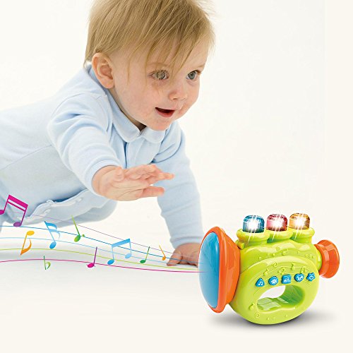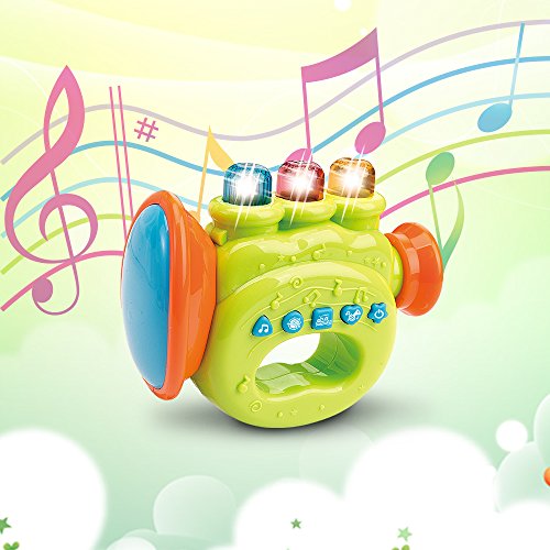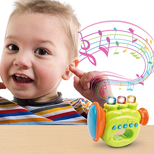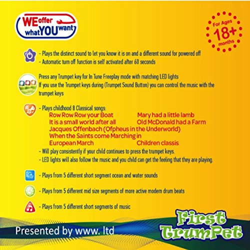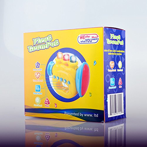 -. Binding : Toy -. Brand : WEofferwhatYOUwant -. EAN : 0741587315544 -. Feature : SMALL portable size for easy travel and fun listening to 8 classic childhood songs with LightsLED Lights / One of two color combinations selected at random / 2 AAA Batteries INCLUDED. Safe,secure battery cover. Stong plastic / Nice feel with 3 keys like a real trumpet and has the correct tone for 3 notes / Baby can toggle music on and off with the Trumpet Keys, everyone can sing along -. IsAdultProduct : 0 -. Label : www limited -. Manufacturer : www limited -. MPN : LYSB01552WE3S-SPRTSEQIP -. PackageQuantity : 1 -. PartNumber : LYSB01552WE3S-SPRTSEQIP -. ProductGroup : Toy -. ProductTypeName : TOYS_AND_GAMES -. Publisher : www limited -. Studio : www limited -. Title : First Trumpet. Battery Operated Music With Features for Learning and Entertainment for Your Baby and Toddler. Portable Small Size. -. UPC : 741587315544